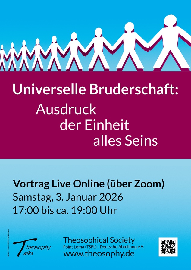 Sie sind herzlich dazu eingeladen, mit uns darüber nachzudenken und diesen Impuls zu stärken! Melden Sie sich rechtzeitig per E-Mail an: info@theosophy.de. Wir senden Ihnen gern kurz vor dem Vortrag einen Teilnahmelink zu!