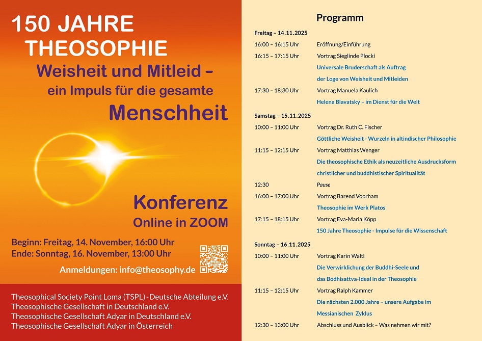 150 Jahre sind vergangen, seit Helena Petrovna Blavatsky in Kooperation mit und im Auftrag der Meister der Großen Weissen Bruderschaft einen erneuten Impuls für die Menschheit setzte und ihr die Uralte Weisheit, Theosophie genannt, brachte. Aus diesem Anlass haben die folgenden Organisationen der theosophischen Bewegung im Geiste universaler Bruderschaft gemeinsam eine Konferenz vorbereitet, zu der wir Sie herzlich einladen möchten. Sie können sich gern auch auf den einzelnen Webseiten über die jeweilige Arbeit der Gesellschaften informieren. Es sind dies die: