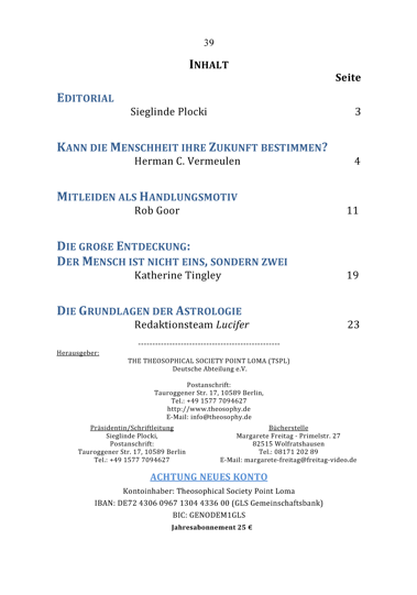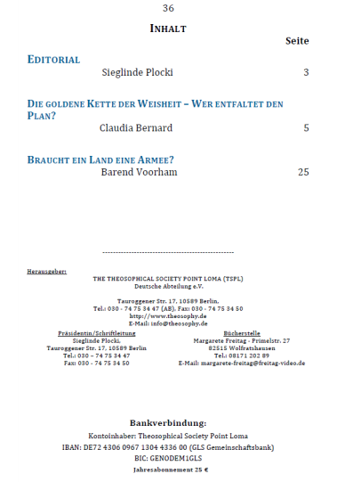 Unsere Zeitschrift "Der Theosophische Pfad" erscheint vierteljährlich. Ein Jahresabonnement für die Druckversion ist zum Preis von 25,00 €/Jahr erhältlich. Bankverbindung und Kontaktadresse finden Sie auch im Impressum unter dem Inhaltsverzeichnis. Wir freuen uns auch über eine Spende zur Unterstützung unserer Arbeit, die wir ehrenamtlich und nur aus eigenen Mitteln leisten.