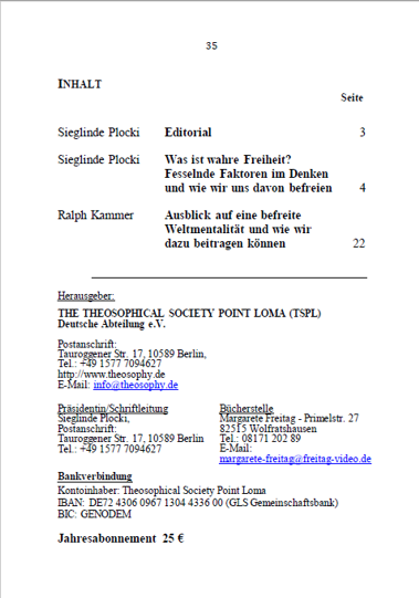 Unsere Zeitschrift "Der Theosophische Pfad" erscheint vierteljährlich. Ein Jahresabonnement für die Druckversion ist zum Preis von 25,00 €/Jahr erhältlich. Bankverbindung und Kontaktadresse finden Sie auch im Impressum unter dem Inhaltsverzeichnis. Wir freuen uns auch über eine Spende zur Unterstützung unserer Arbeit, die wir ehrenamtlich und nur aus eigenen Mitteln leisten.